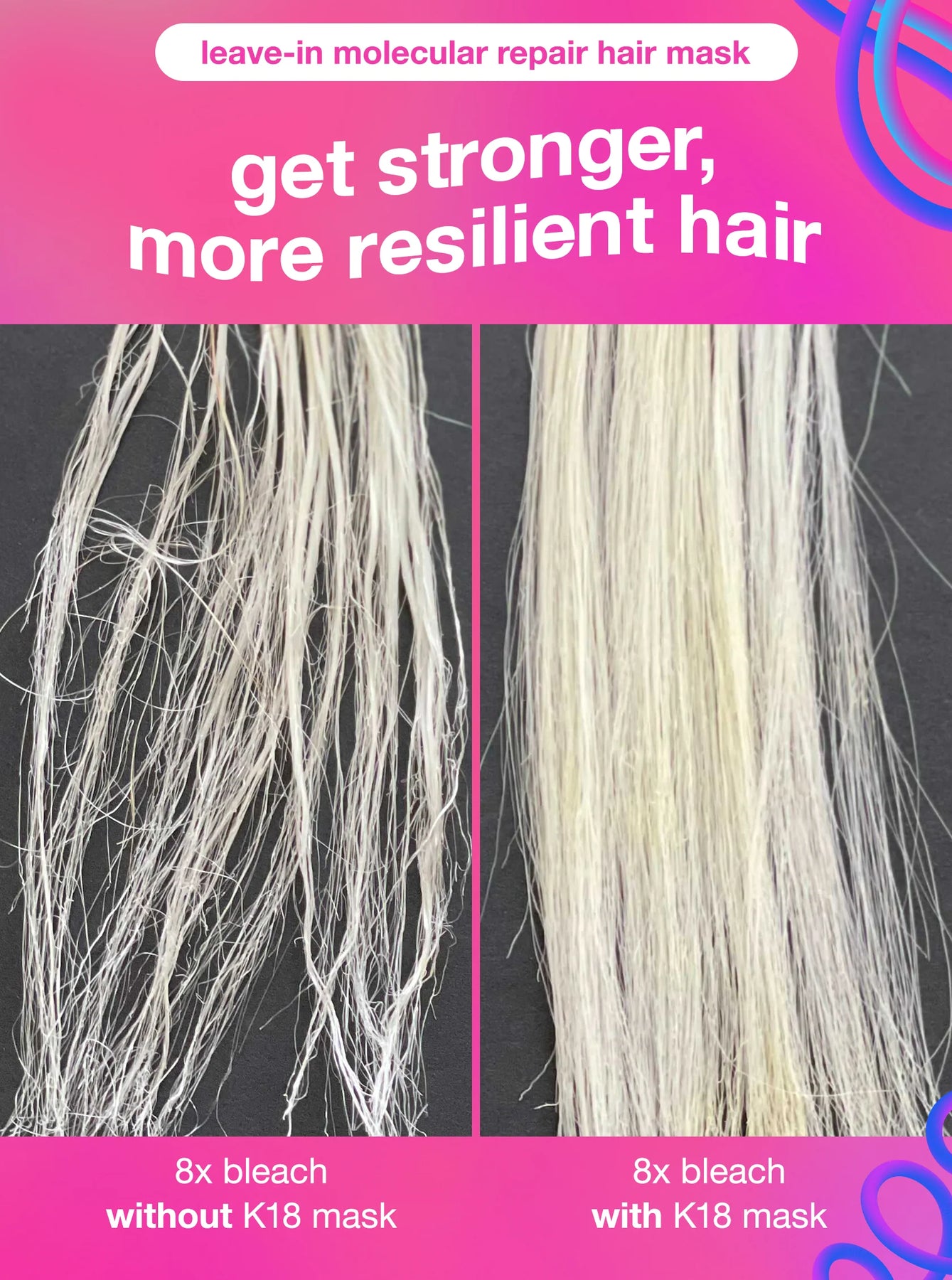 - Apply 3-9 pumps of K18 leave-in molecular repair hair mask based on your length and density, starting at the ends and working up towards the roots
